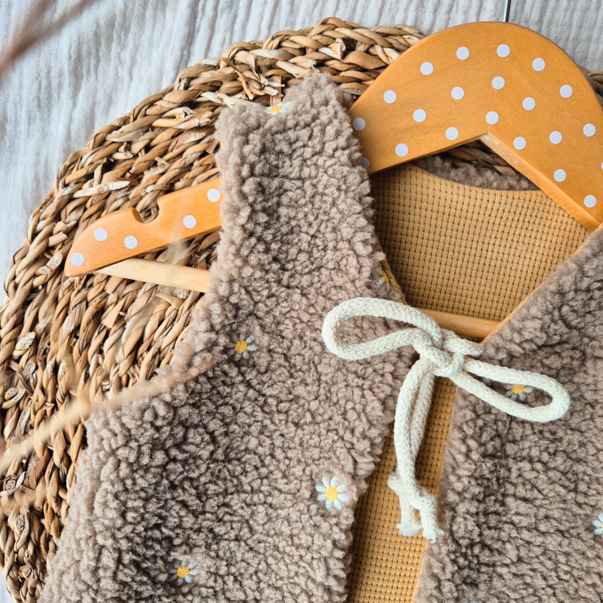 Diese flauschige Weste mit zarten Gänseblümchen ist nicht nur wunderschön, sondern auch super gemütlich. Außen habe ich sie aus weichem, warmem Teddyplüsch genäht, innen ist sie mit anschmiegsamem Waffelstrickjersey in Ocker/Senf gefüttert – ein echter Hingucker mit Wohlfühlfaktor.