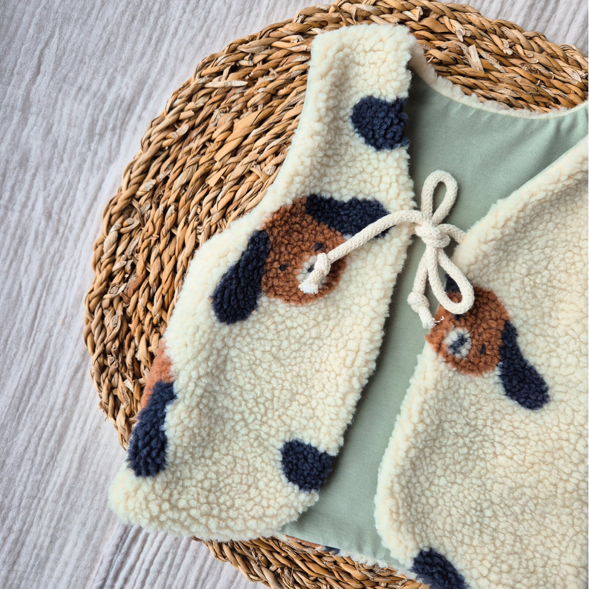 Diese flauschige Weste mit süßem Hundemuster ist ein echter Wohlfühl-Liebling für kleine Tierfreunde. Außen kuscheliger Teddyplüsch mit braun-blauen Hundemotiven, innen angenehm weicher Jersey in dusty mint – eine Kombination, die nicht nur gut aussieht, sondern sich auch wunderbar trägt.