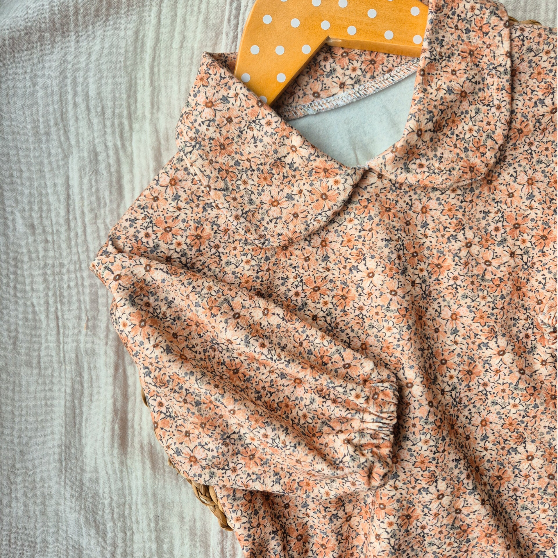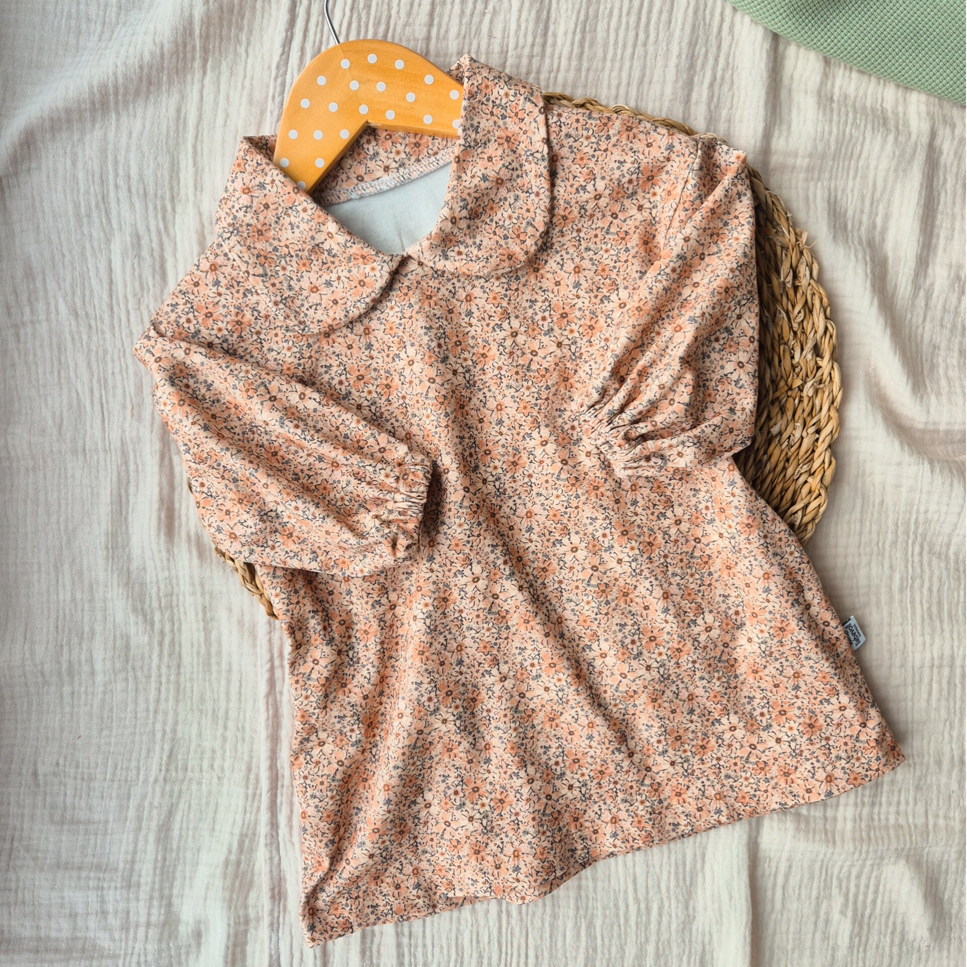 Dieses liebevoll genähte Kleid aus weichem Baumwolljersey bringt nicht nur Komfort, sondern auch einen Hauch Nostalgie in den Alltag deines Kindes. Der zarte Allover-Blumenprint wirkt wie ein Spaziergang durch einen sonnigen Garten, während der verspielte Bubikragen das Design abrundet und einen Hauch von Vintage-Charme verleiht.