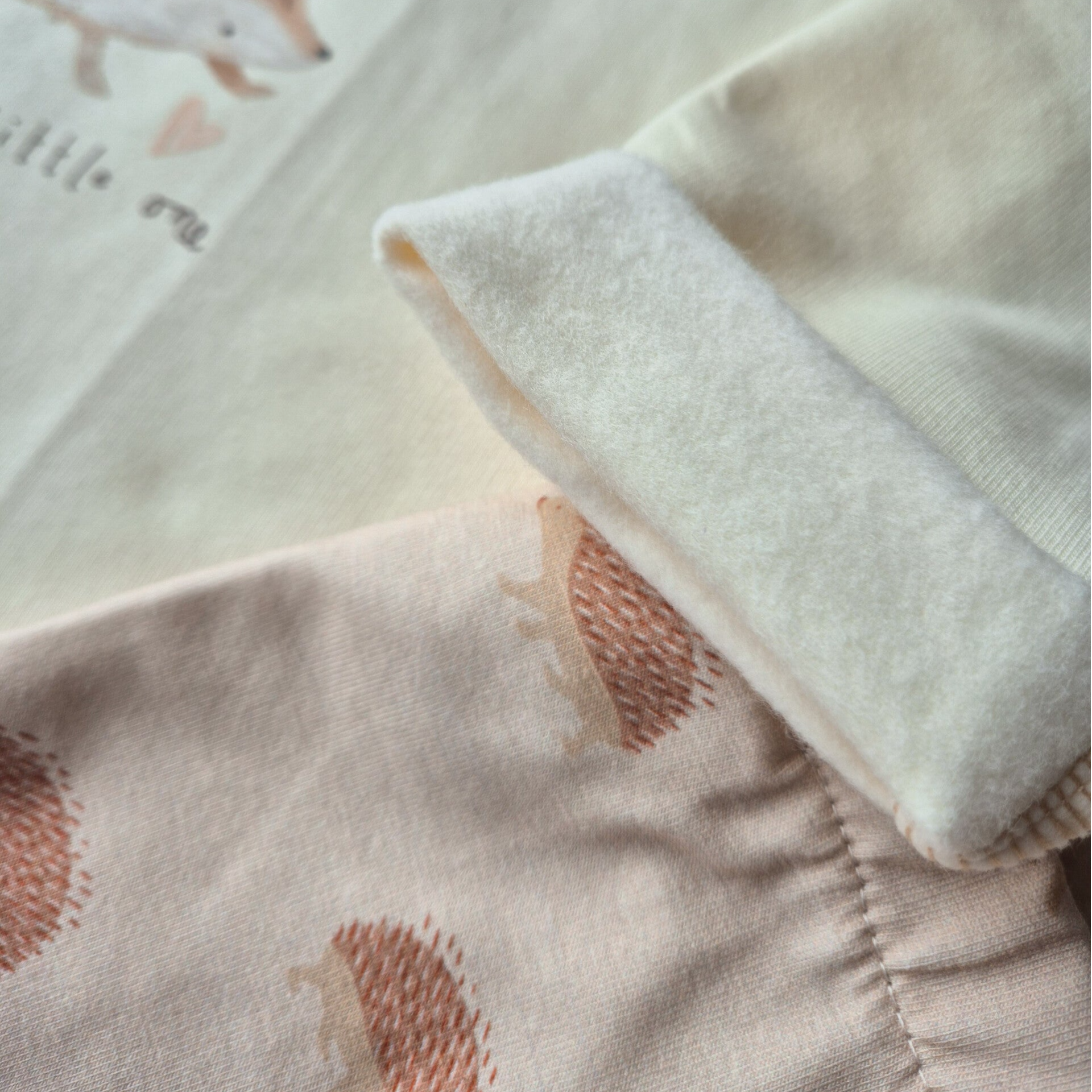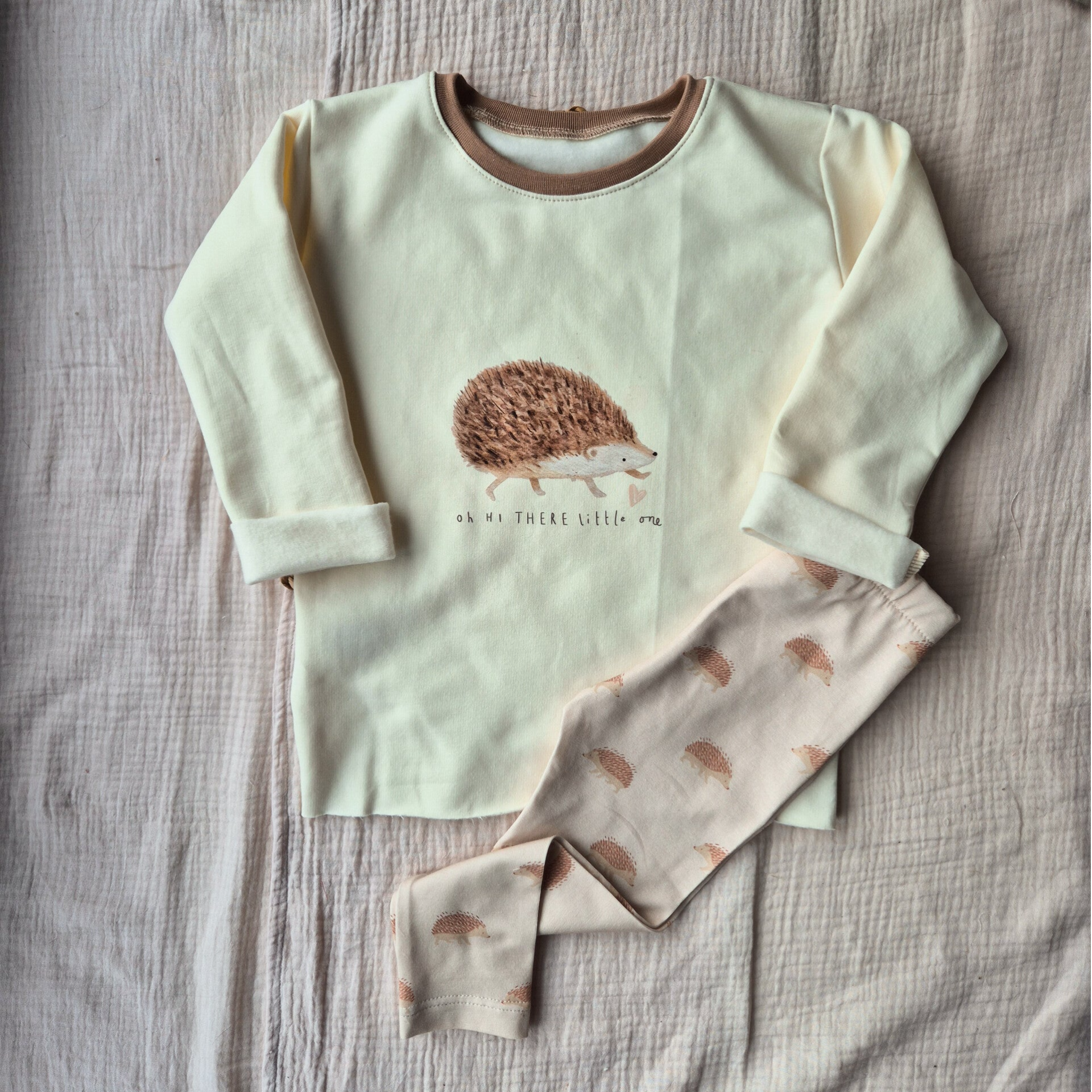 Dieses Oberteil ist wie eine sanfte Umarmung: Aus herrlich weichem Kuschelsweat gefertigt und mit einem niedlichen Igelprint verziert, begleitet es dein Kind liebevoll durch kühle Tage. Der warme Cremeton, kombiniert mit dem zarten Druck, schafft eine ruhige, natürliche Stimmung – perfekt für kleine Waldfans und Träumer.