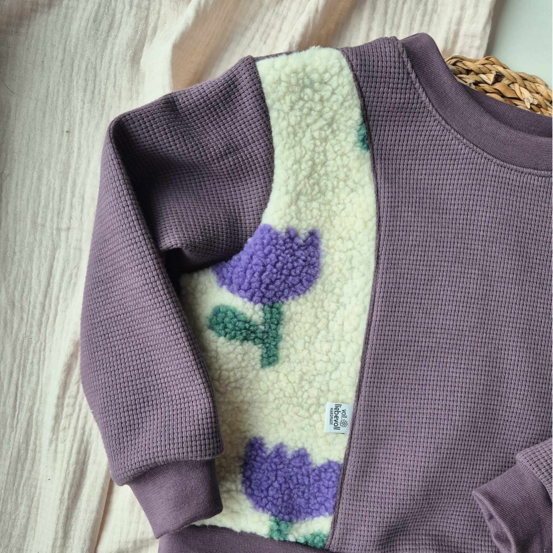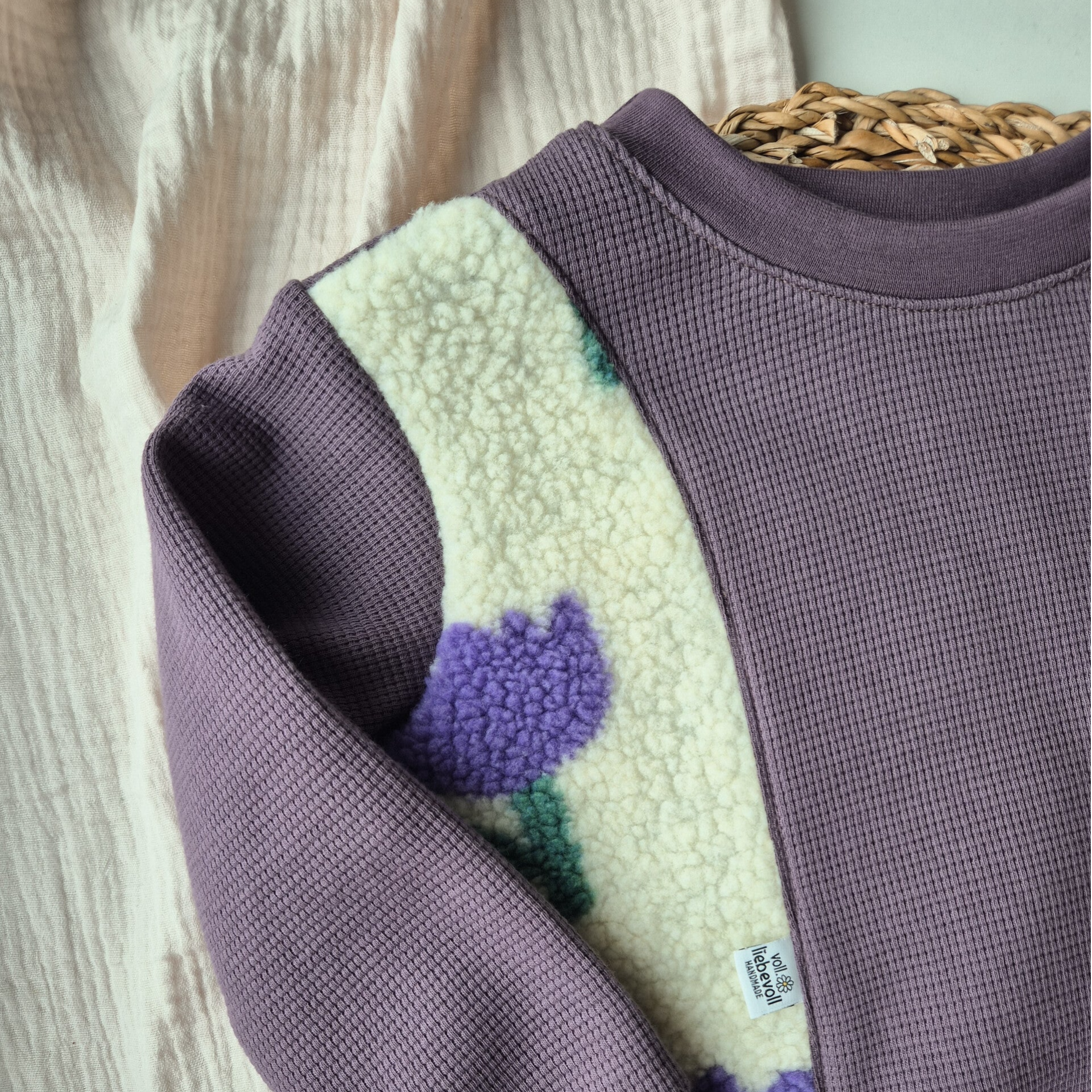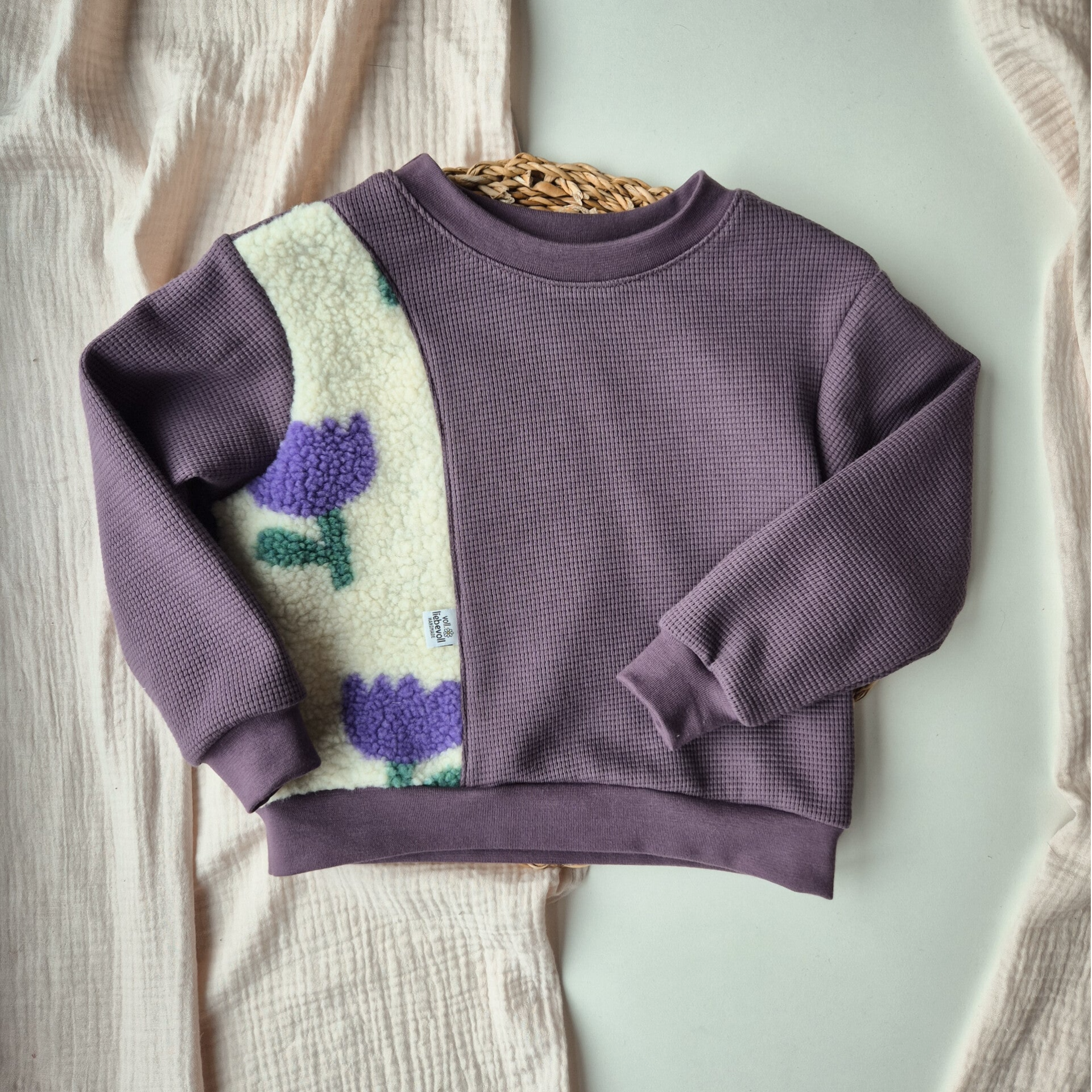 Dieses Sweatshirt habe ich aus weichem Waffeljersey in einem sanften Pflaumenton genäht und mit einem besonderen Detail kombiniert: einem kuscheligen Einsatz aus Tulpen-Teddyplüsch.