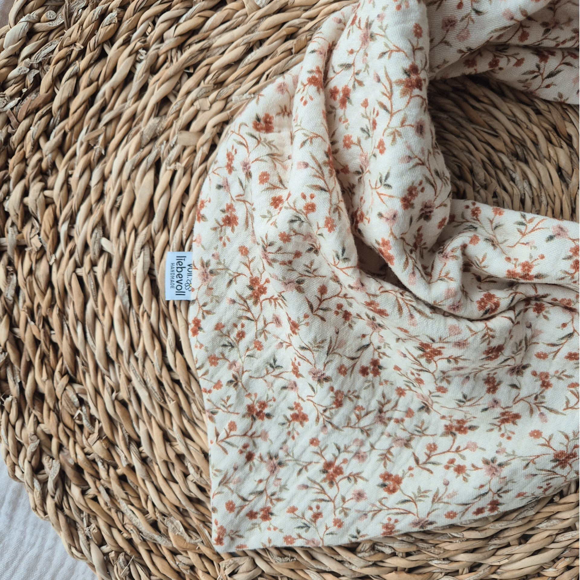 Dieses Halstuch habe ich aus einem besonders weichen Musselin mit zartem Blütenmuster genäht – leicht, anschmiegsam und einfach hübsch. Es hält kleine Hälse angenehm warm, ohne zu beschweren, und ist dabei ein liebevolles Detail für jedes Outfit.