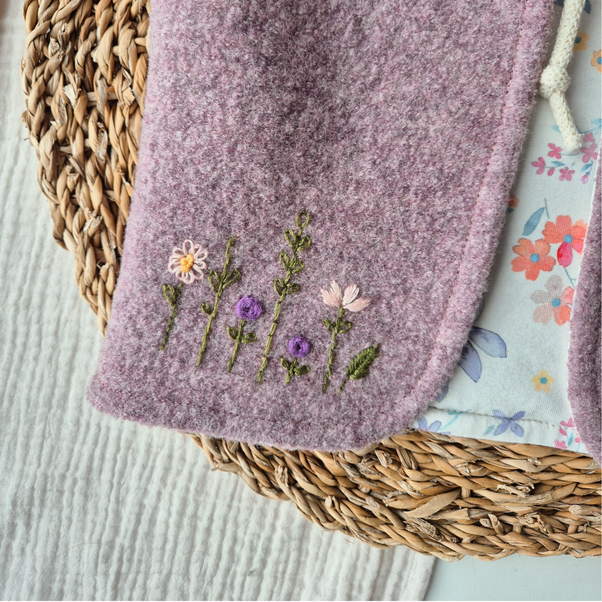 Diese zauberhafte Weste aus hochwertigem Wollwalk ist ein kleines Kunstwerk zum Anziehen: Außen warm und weich in einem sanften Mauve-Ton – innen liebevoll gefüttert mit floralem Jersey und veredelt durch zarte, von Hand gestickte Wildblumen.