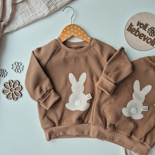 Auf der Vorderseite sitzt eine liebevoll aufgenähte Hasen-Applikation – dezent, hochwertig und absolut kindgerecht. Ein kleines Label an der Seite rundet das Design stilvoll ab.