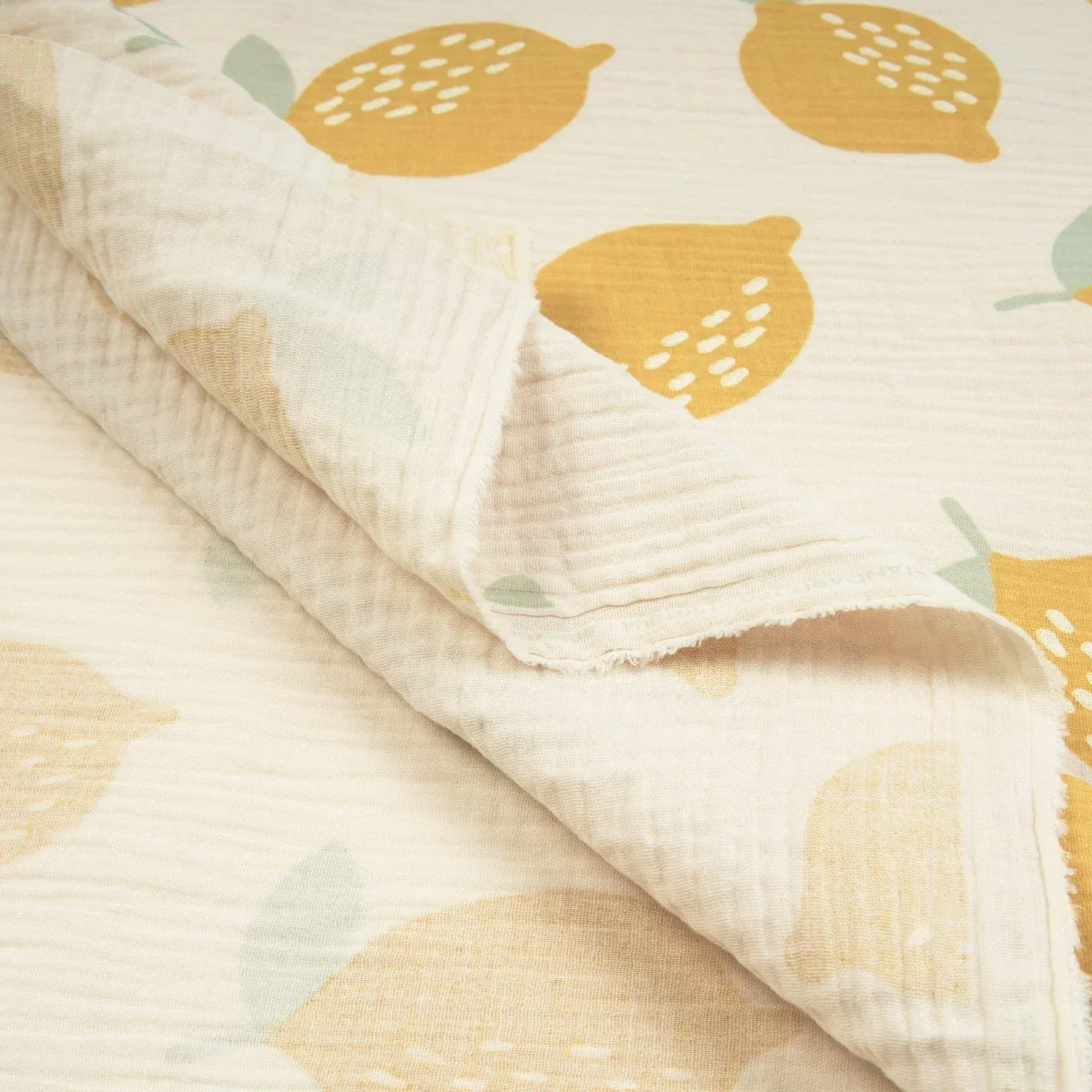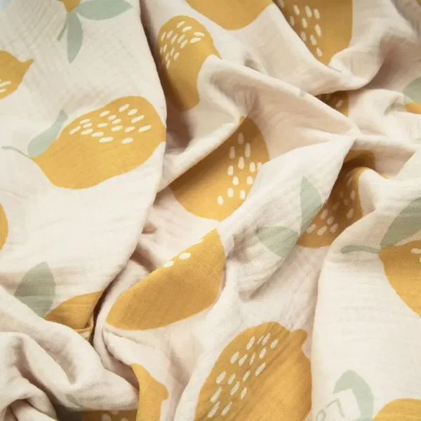 Dieser wunderschöne Musselin begeistert mit seinem frischen Zitronen-Design auf einem sanften Beigeton. Der Stoff ist angenehm weich, luftig und besonders hautfreundlich – perfekt für Baby- und Kinderkleidung sowie leichte Sommerteile. Durch die typische Musselin-Struktur wirkt er leicht gekreppt und bekommt nach dem Waschen seinen ganz eigenen, natürlichen Look. Ideal für Kleider, Blusen, Pumphosen, Tücher oder Decken.